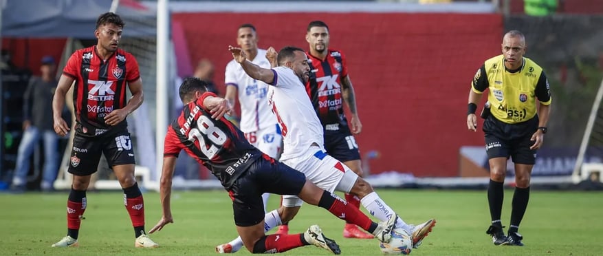 O duelo começou equilibrado, com ambos os times buscando o controle do jogo. O primeiro tempo foi marcado por faltas duras, cartões amarelos e chances desperdiçadas. O Vitória chegou a assustar com um chute no travessão, mas o Bahia também mostrou perigo, especialmente com Ademir, que quase abriu o placar.